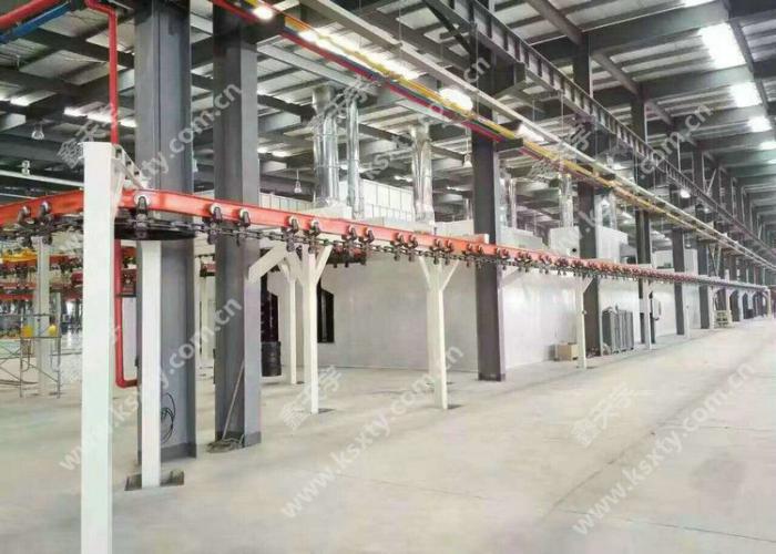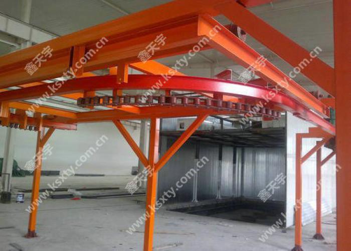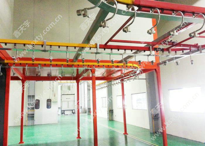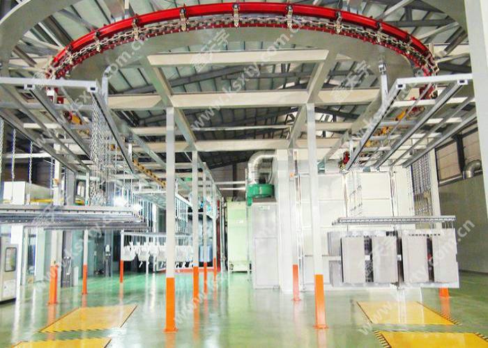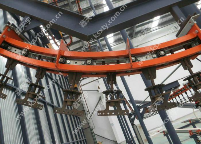 由一條萬向輸送鏈帶動(dòng)鋁型材以指定的路軌移動(dòng), 整條線鏈條長(zhǎng)度在 100~150 米,可耐高溫。其運(yùn)行速度與噴槍數(shù)量和噴粉厚度有關(guān), 一般情況下單面十二支噴槍的話輸送鏈運(yùn)行速度在1.5 ~2m/min。